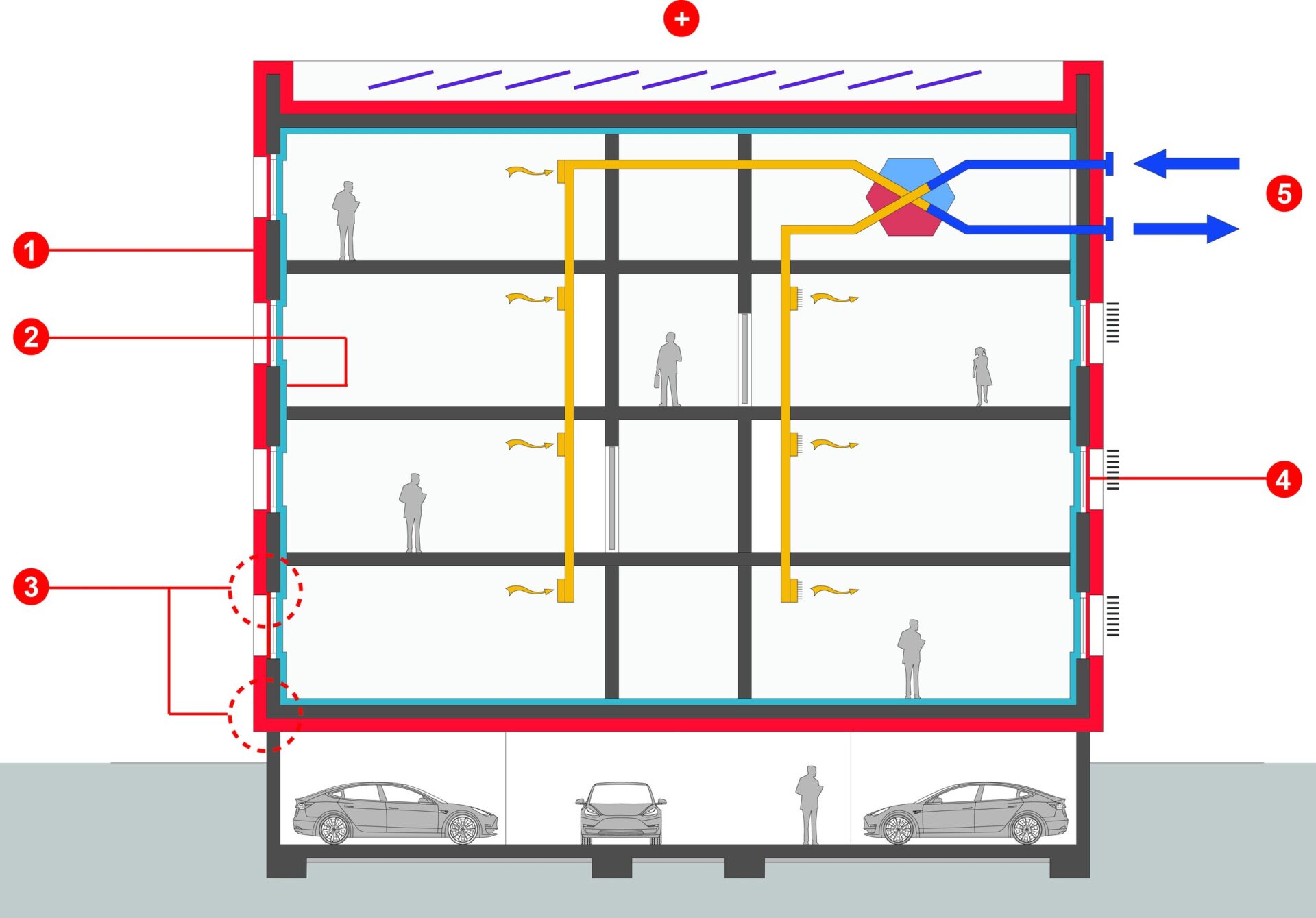 - Αεροστεγανότητα: κάθε εργασία πρέπει να αποφεύγει ανεξέλεγκτες απώλειες ή ροές αέρα μέσα από το κέλυφος.